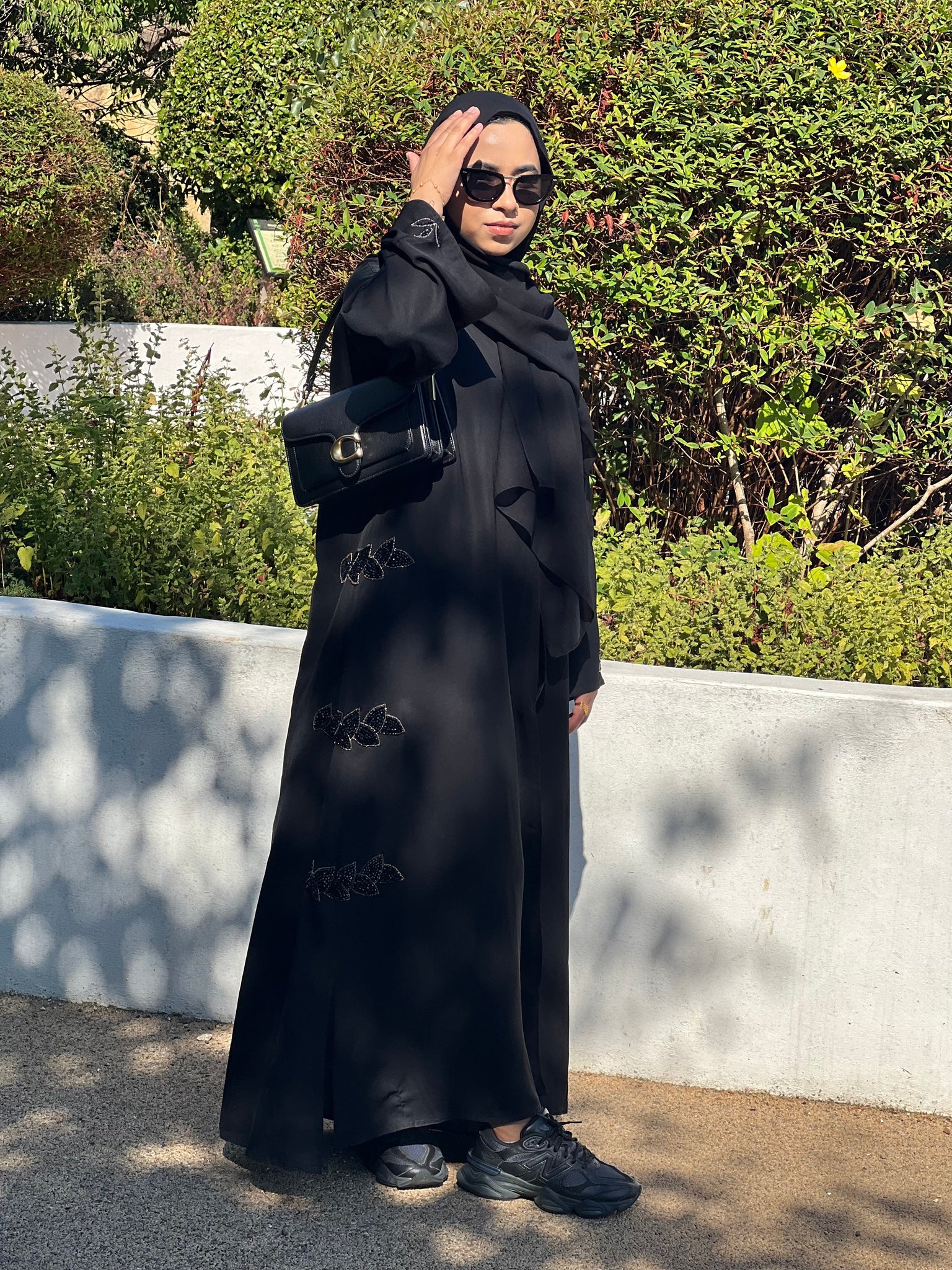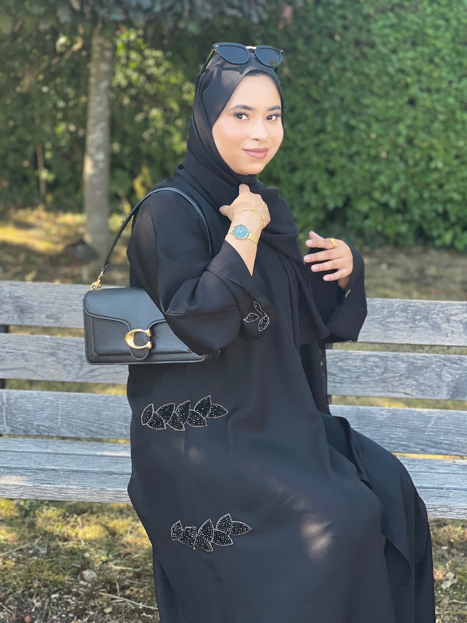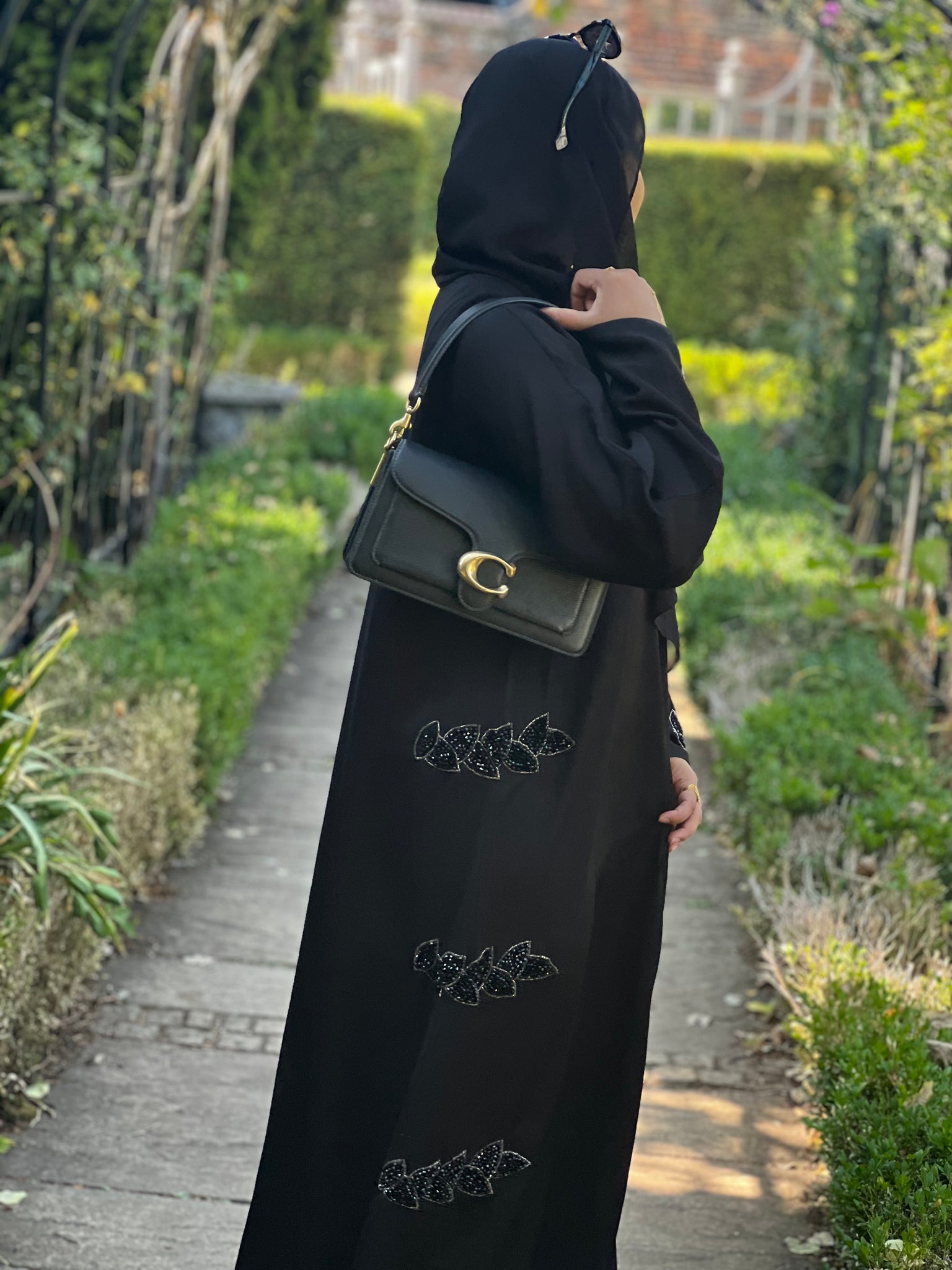 - A classic black abaya with hand stitched beads on the both sides of the abaya and sleeves.